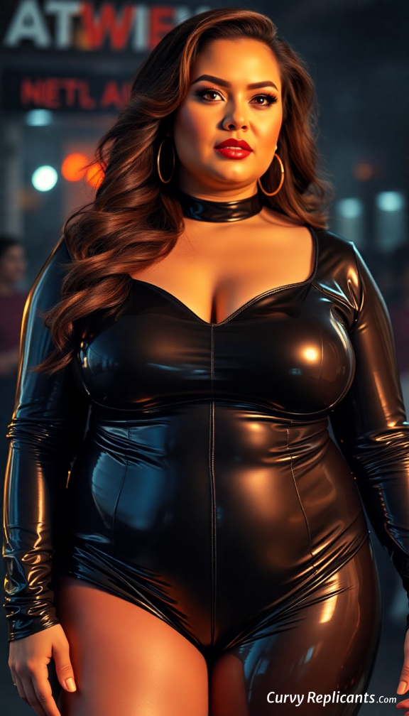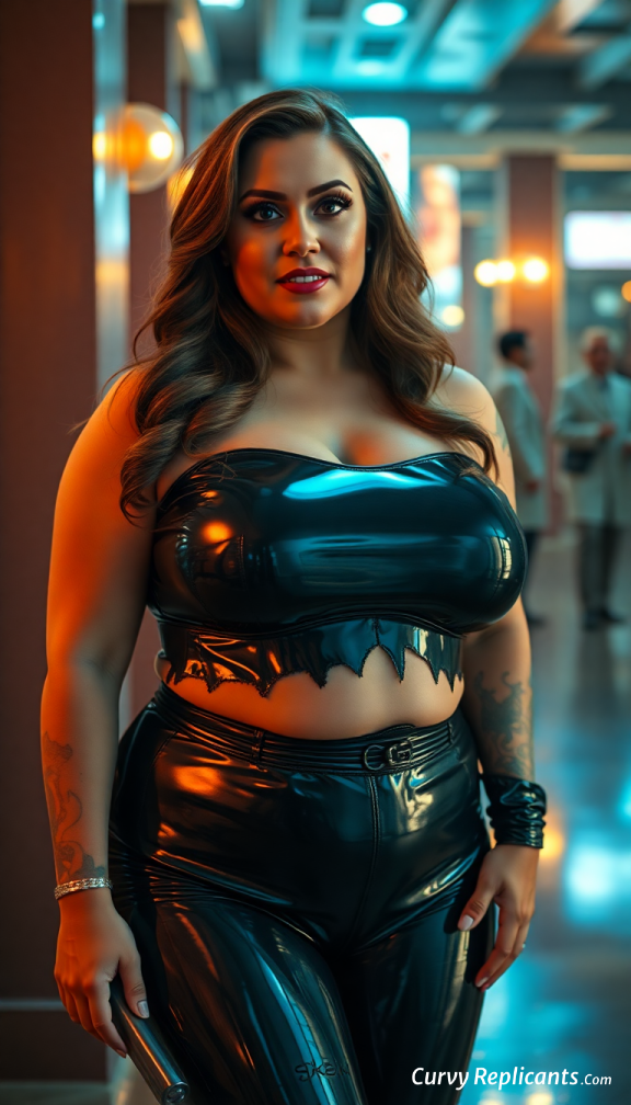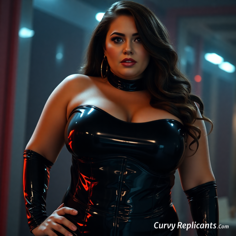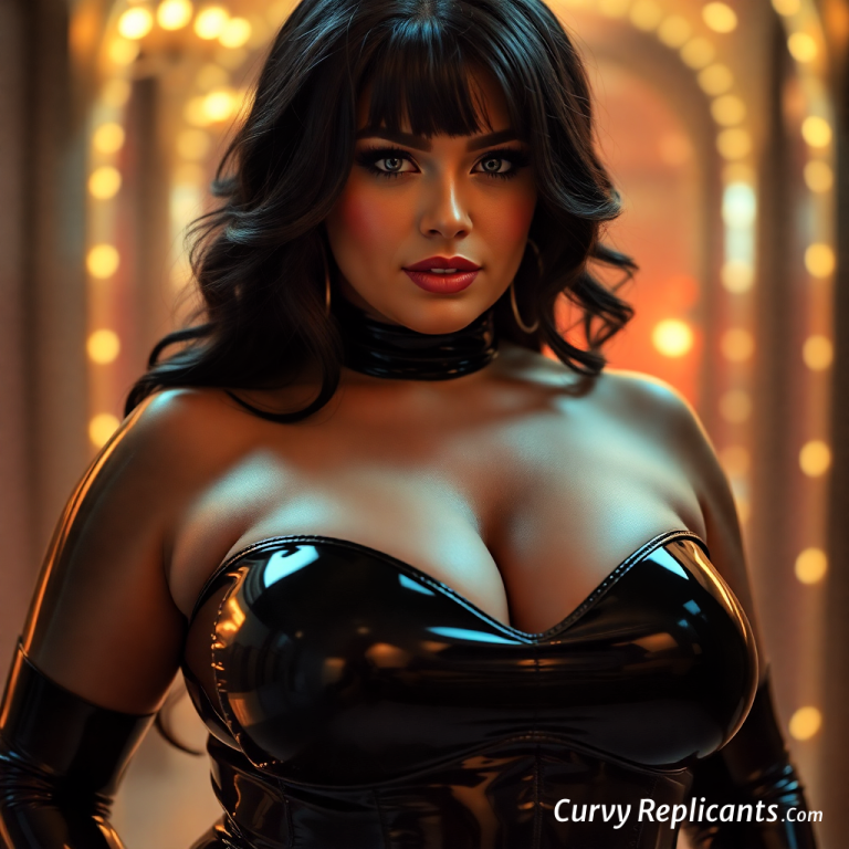 [ Show image of Busty, full figured Woman dressed in shiny latex outfit ]
